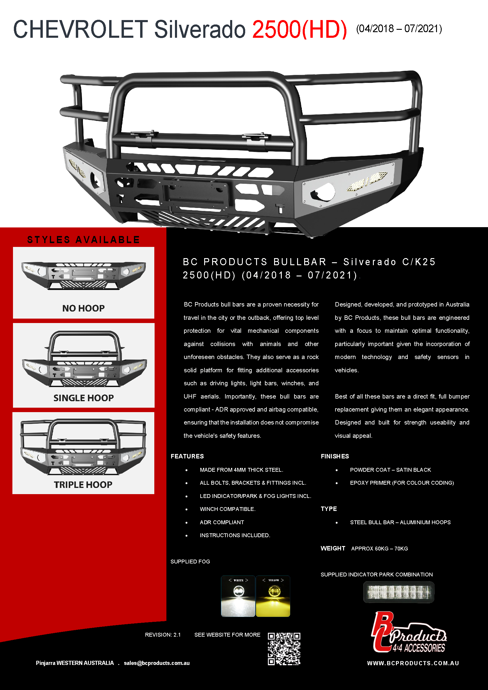 BC Products bull bars are a proven necessity for travel in the city or the outback, offering top level protection for vital mechanical components against collisions with animals and other unforeseen obstacles. They also serve as a rock solid platform for fitting additional accessories such as driving lights, light bars, winches, and UHF aerials. Importantly, these bull bars are compliant – ADR approved and airbag compatible, ensuring that the installation does not compromise the vehicle’s safety features.
